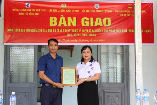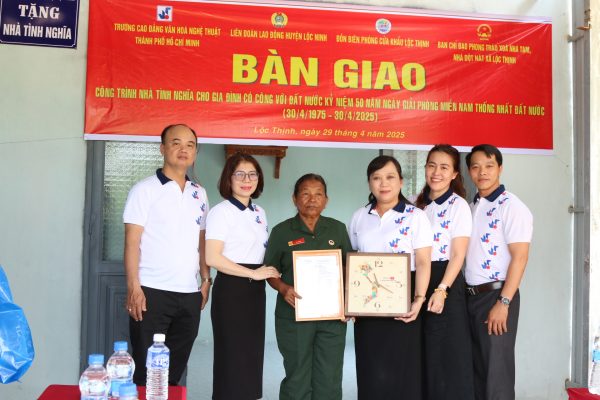Vào lúc 11 giờ 30 phút ngày 29/4/2025 – ngay trước thềm thời khắc lịch sử 30/4 – Trường Cao đẳng Văn hóa Nghệ thuật TP.HCM đã long trọng trao tặng căn nhà tình nghĩa cho gia đình đồng chí Lâm Xê – Thị Bình. Trong niềm vui đong đầy của hai ông bà, trong sự xúc động và tự hào của chính quyền địa phương, của tập thể viên chức, sinh viên nhà trường, căn nhà không chỉ là mái ấm vật chất, mà còn là biểu tượng của nghĩa tình, của sự tri ân, của tinh thần dân tộc được thắp lên từ quá khứ oanh liệt đến hiện tại đầy nhân văn. Và đó cũng chính là món quà chân thành, đầy ý nghĩa của tập thể Trường CĐ. VHNT gửi đến những người đã góp một phần cuộc đời của mình vì hòa bình, độc lập ngày hôm nay.