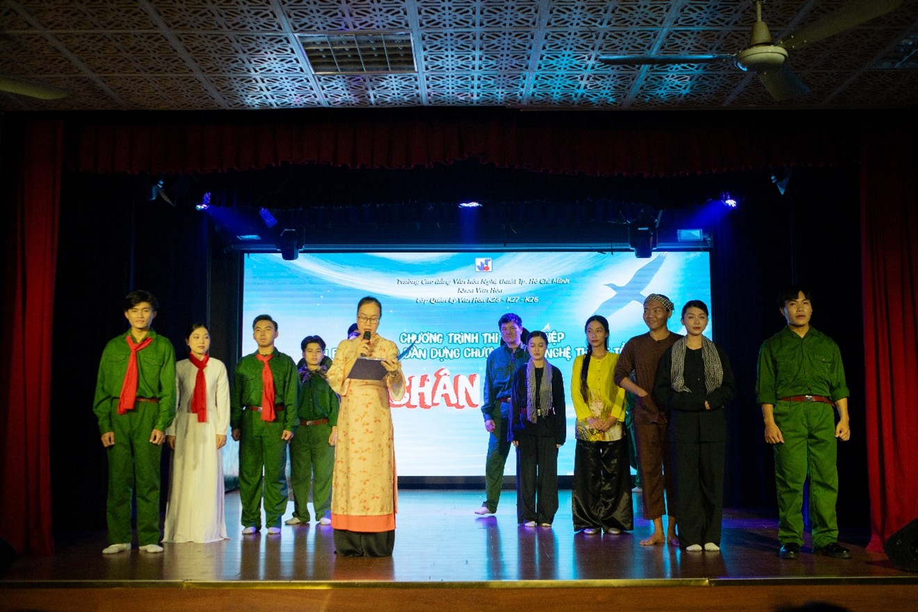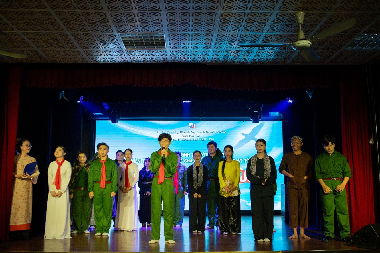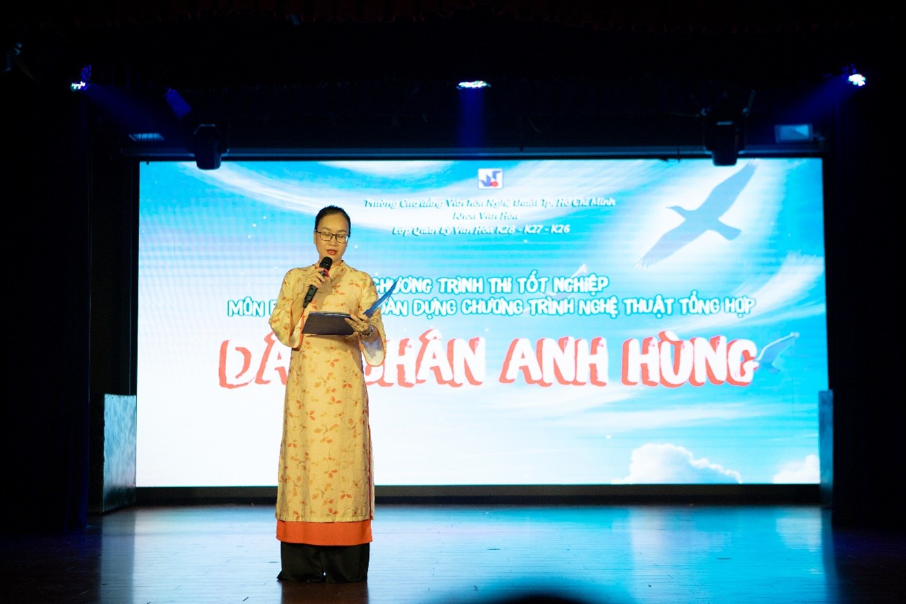 Vào 14h30 ngày 6/3/2025, tại Hội trường A, Trường Cao đẳng Văn hóa Nghệ thuật TP. Hồ Chí Minh (05 Nam Quốc Cang, Phường. Phạm Ngũ Lão, Quận 1, TP.HCM), chương trình thi tốt nghiệp với chủ đề “Dấu chân anh hùng” của Lớp Quản lý Văn hóa – Khoa Văn hóa khóa 28, 26, 27 đã tái hiện những dấu mốc quan trọng trong lịch sử dân tộc nhân dịp kỷ niệm 50 năm ngày giải phóng miền Nam, thống nhất đất nước (30/4/1975 – 30/4/2025).