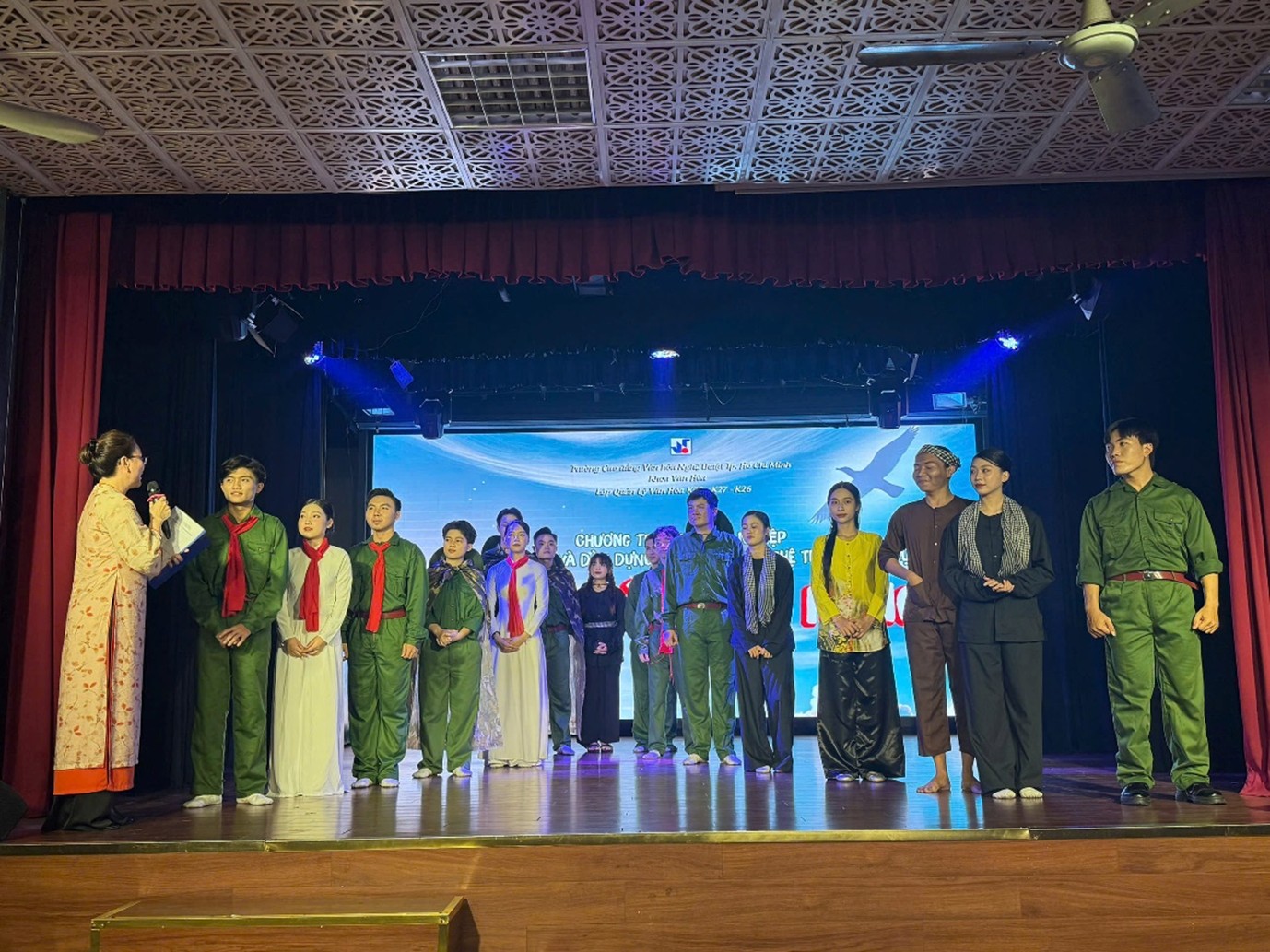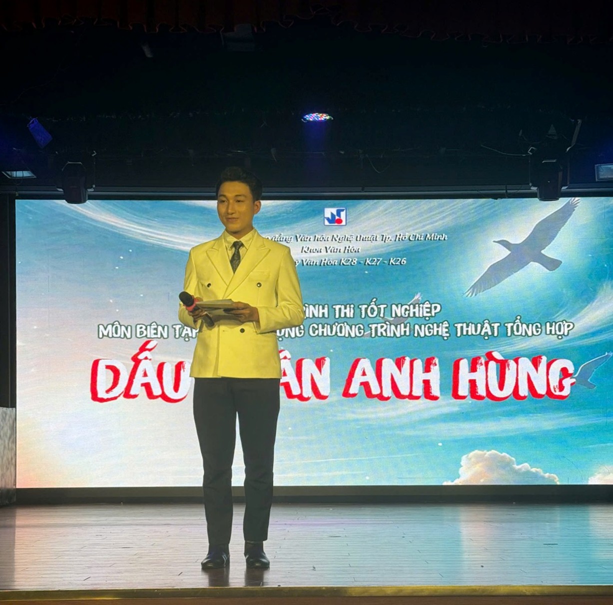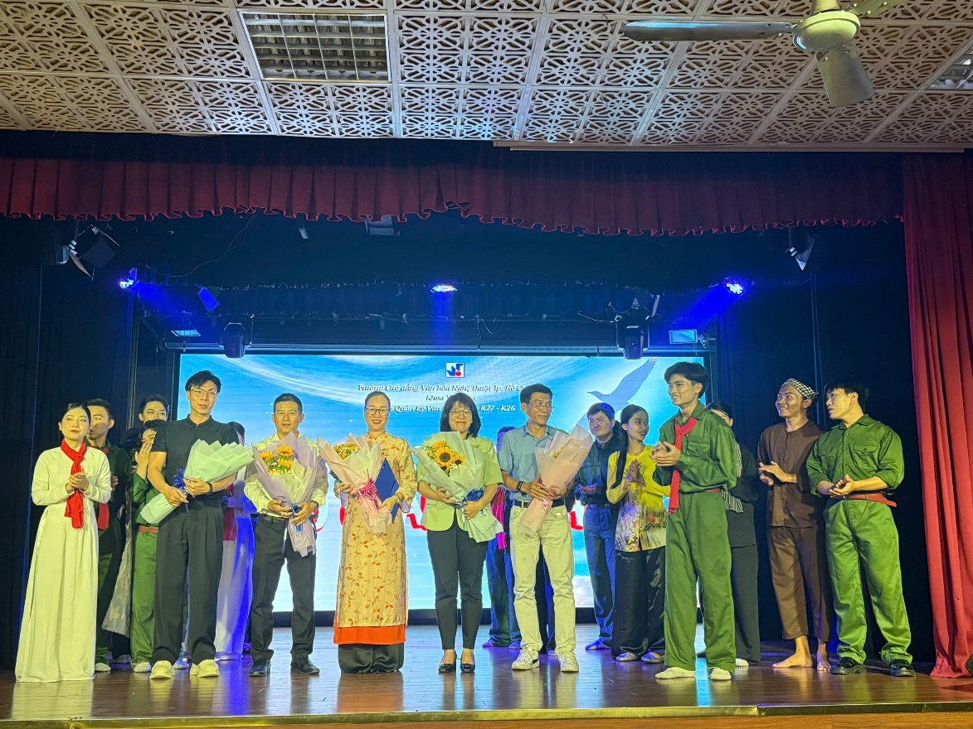 Vào 14h30 ngày 6/3/2025, tại Hội trường A, Trường Cao đẳng Văn hóa Nghệ thuật TP. Hồ Chí Minh (05 Nam Quốc Cang, Phường. Phạm Ngũ Lão, Quận 1, TP.HCM), chương trình thi tốt nghiệp với chủ đề “Dấu chân anh hùng” của Lớp Quản lý Văn hóa – Khoa Văn hóa khóa 28, 26, 27 đã tái hiện những dấu mốc quan trọng trong lịch sử dân tộc nhân dịp kỷ niệm 50 năm ngày giải phóng miền Nam, thống nhất đất nước (30/4/1975 – 30/4/2025).