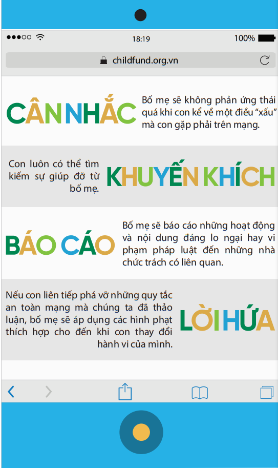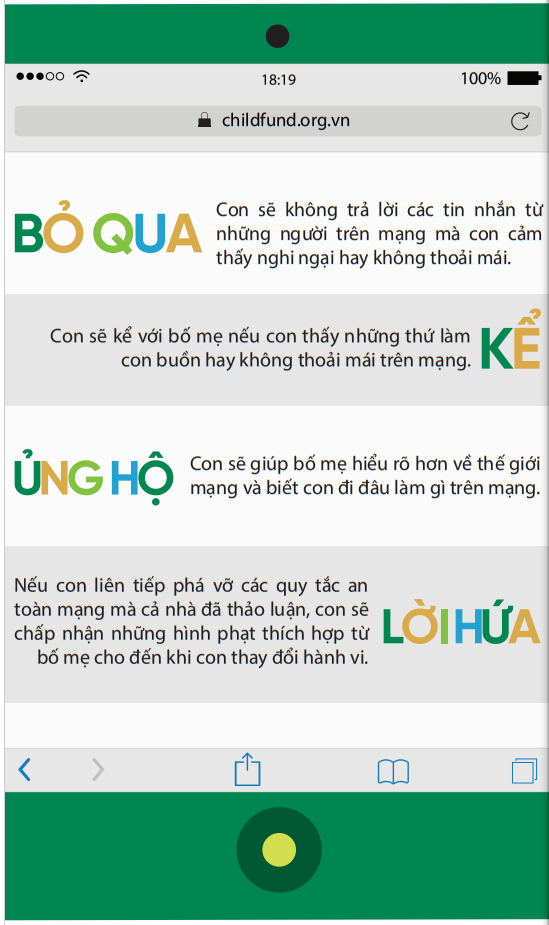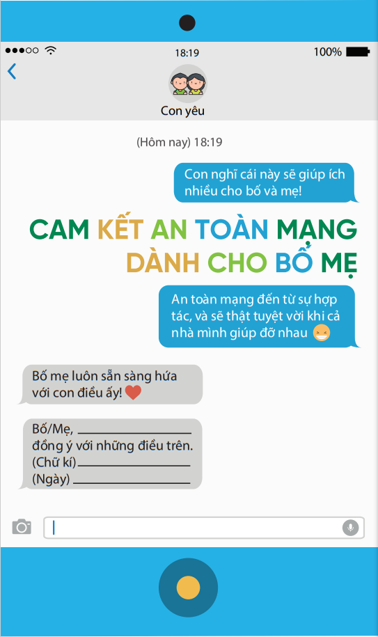Dưới đây là một số gợi ý về những điều cha mẹ và con có thể cam kết thực hiện cùng nhau, từ cách ứng xử của con trên môi trường mạng, cách cha mẹ có thể trở thành đối tác an toàn trên mạng của con: