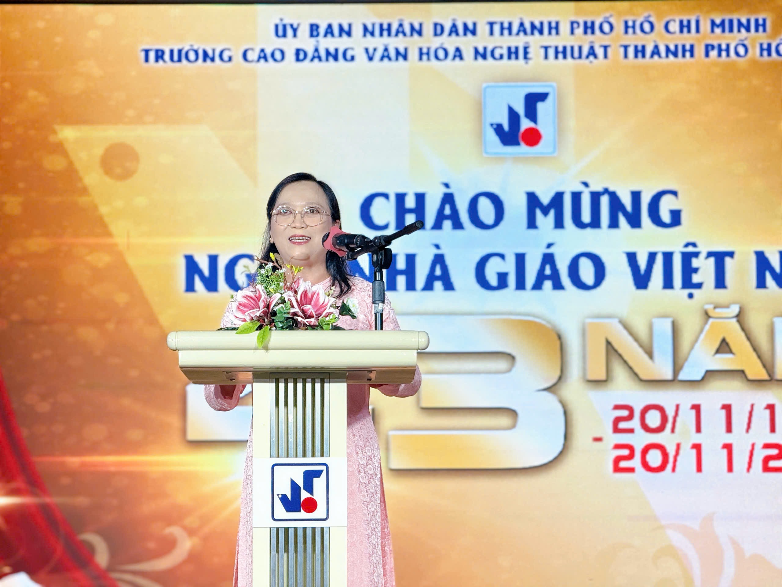 Phát biểu tại buổi lễ, ThS. Hồ Ngọc Minh – Bí thư Chi bộ, Quyền Hiệu trưởng gửi lời chúc mừng đến đội ngũ nhà giáo, đồng thời nhấn mạnh vai trò của người thầy trong bối cảnh đổi mới giáo dục nghề nghiệp. Lãnh đạo Nhà trường ghi nhận những nỗ lực của tập thể giảng viên trong việc duy trì và nâng cao chất lượng đào tạo các ngành văn hóa – nghệ thuật, xem đây là nền tảng để Trường hướng tới mục tiêu chuẩn hóa chương trình và đáp ứng nhu cầu nhân lực sáng tạo của Thành phố.