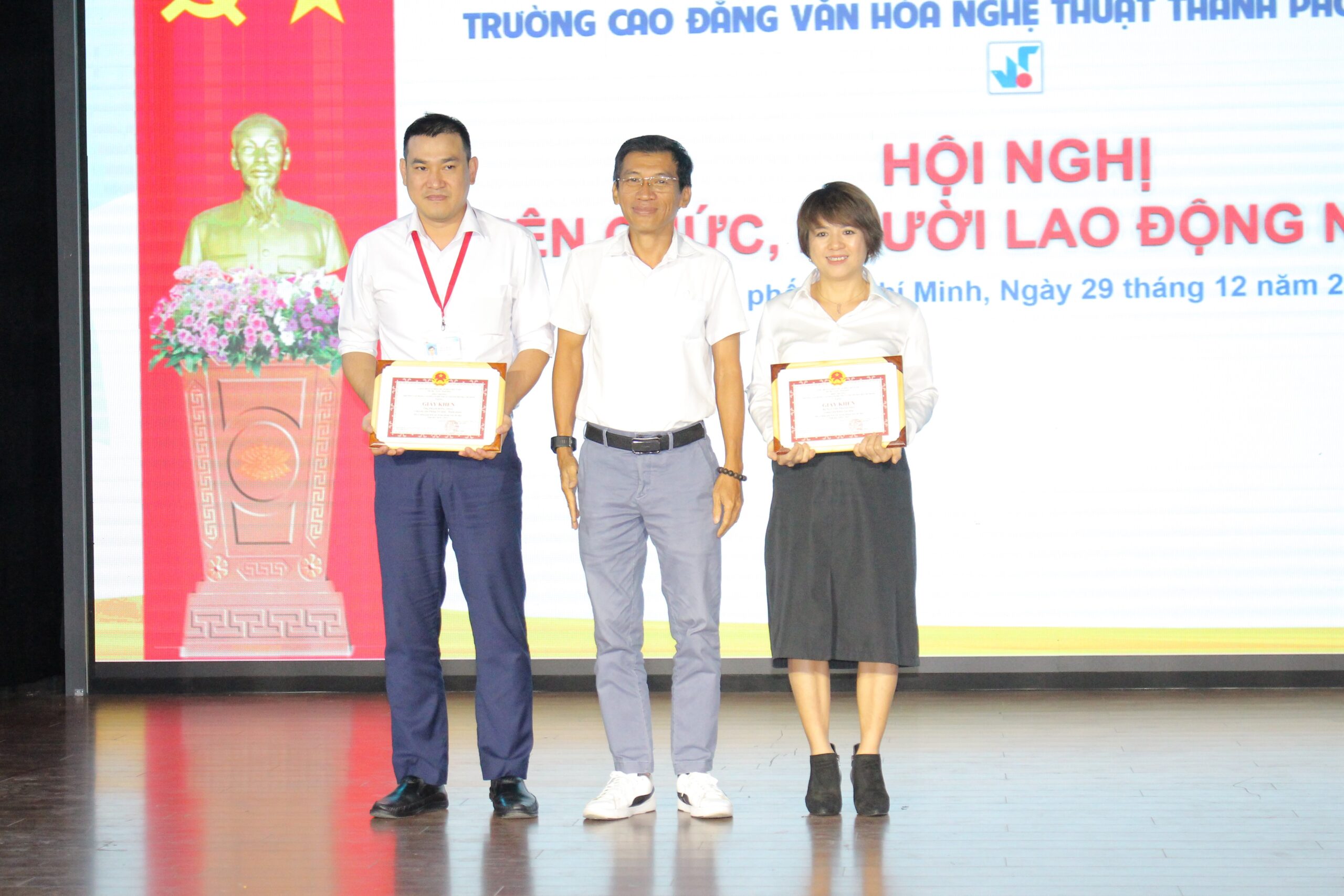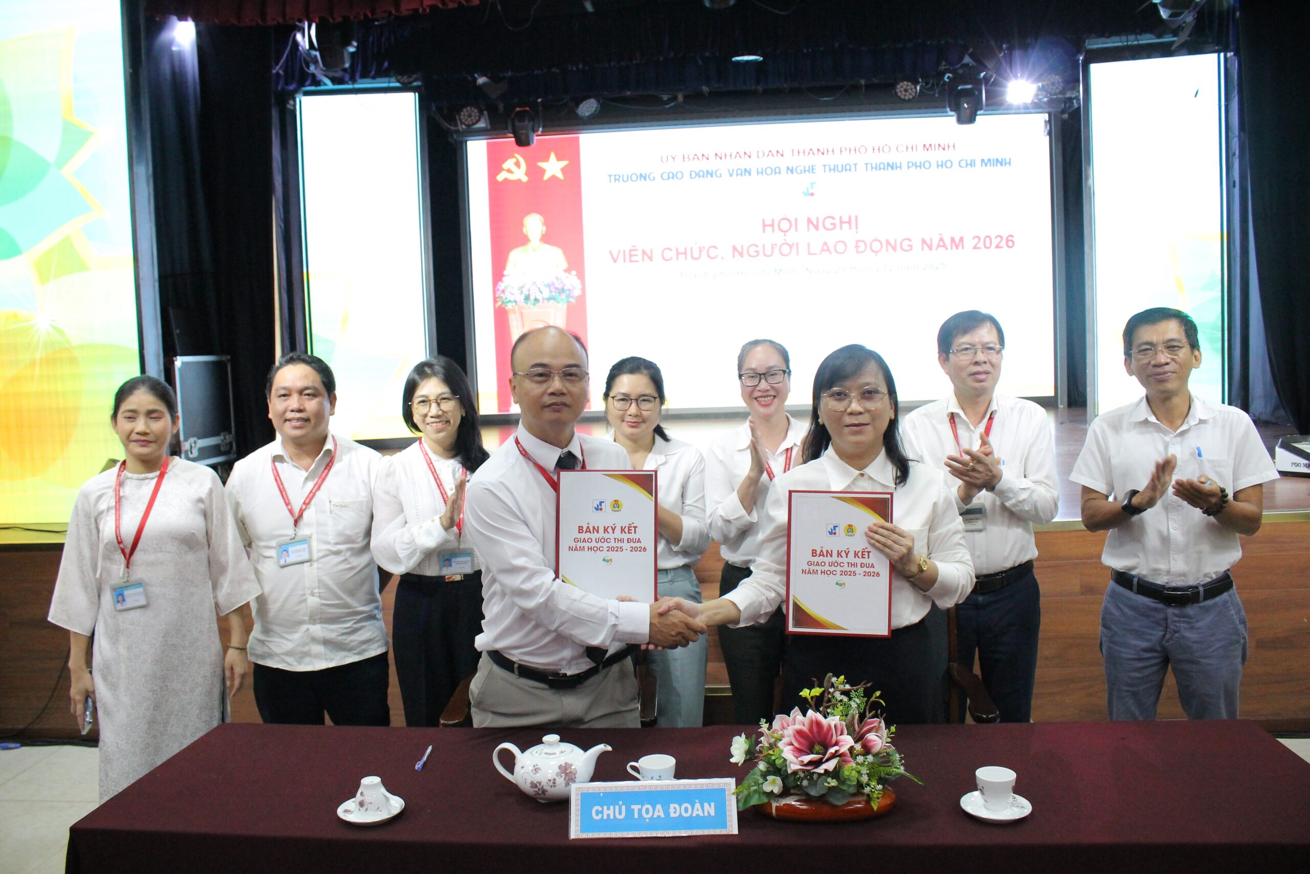 Đồng thời cũng đã thông qua Quy chế chi tiêu nội bộ năm 2026, làm cơ sở thực hiện công tác quản lý, sử dụng tài chính bảo đảm công khai, minh bạch. Trong khuôn khổ chương trình, Ban Lãnh đạo và Ban Chấp hành Công đoàn Trường Cao đẳng Văn hóa Nghệ thuật TPHCM đã tiến hành ký kết Giao ước thi đua năm 2026. Hoạt động này thể hiện quyết tâm phối hợp chặt chẽ giữa các tổ chức trong Nhà trường, nhằm thực hiện hiệu quả mục tiêu, nhiệm vụ đã đề ra, góp phần xây dựng tập thể đơn vị đoàn kết, vững mạnh. Bên cạnh đó, Hội nghị cũng đã tổ chức tuyên dương và khen thưởng các tập thể, cá nhân có thành tích xuất sắc, hoàn thành tốt nhiệm vụ trong năm 2025. Đây là sự ghi nhận xứng đáng đối với những nỗ lực, đóng góp tích cực của đội ngũ viên chức và giảng viên, đồng thời tạo động lực thúc đẩy phong trào thi đua lao động sang tạo trong toàn trường.